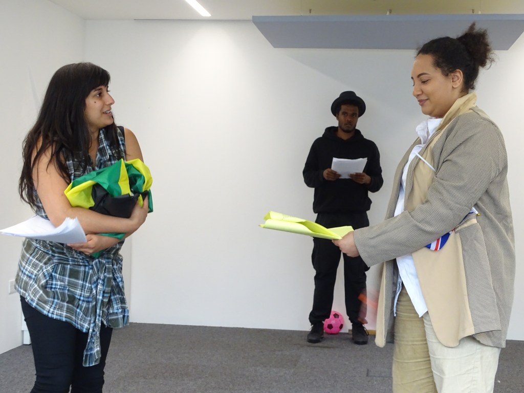 Then it was time to edit. We chose to create a play that did not have specific characters, but instead formed a fast-paced piece that jumps around between lots of different people, back and forth with the performers taking on multiple roles.