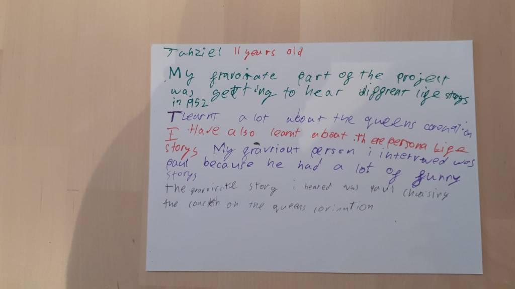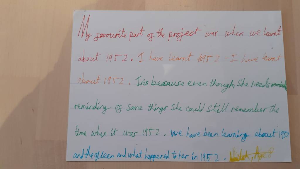 “My favourite part of the project was when we learnt about 1952. I have learnt 1952 – I have learnt about 1952. Iris [was my favourite person to interview] because even though she needs reminding of some things she could still remember the time when it was 1952. We have been learning about 1952 and the queen and what happened ther [sic] in 1952.” Nailah, Age 8.