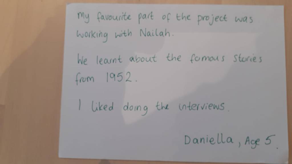 “My favourite part of the project was working with Nailah. We learnt about the famous stories from 1952. I liked doing the interviews.” Daniella, Age 5.