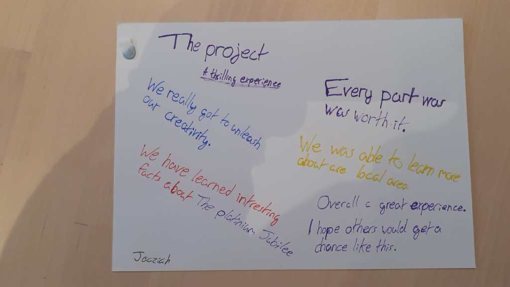 “The project. A thrilling Experience. We really got to unleash our creativity. We have learned interesting facts about the Platinum Jubilee. Every part was worth it. We was able to learn more about [our] local area. Overall a great experience. I hop others would get a chance like this” Jaaziah.